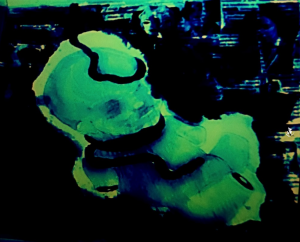 Syvissä vesissä, pimeässä vain äänesi kuulen. Vesivärimaalaus kierrätyspaperille, digieditointi.