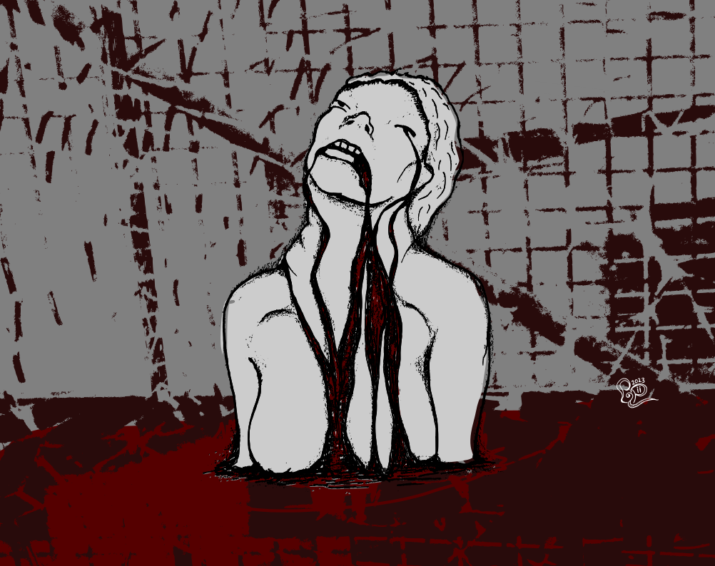 Missä kohtaa keho viestii että olis syytä ruveta pelkäämään niin lujaa ettei enää tajua mistään mitään? Tussipiirros, digieditointi.Paniikin aika