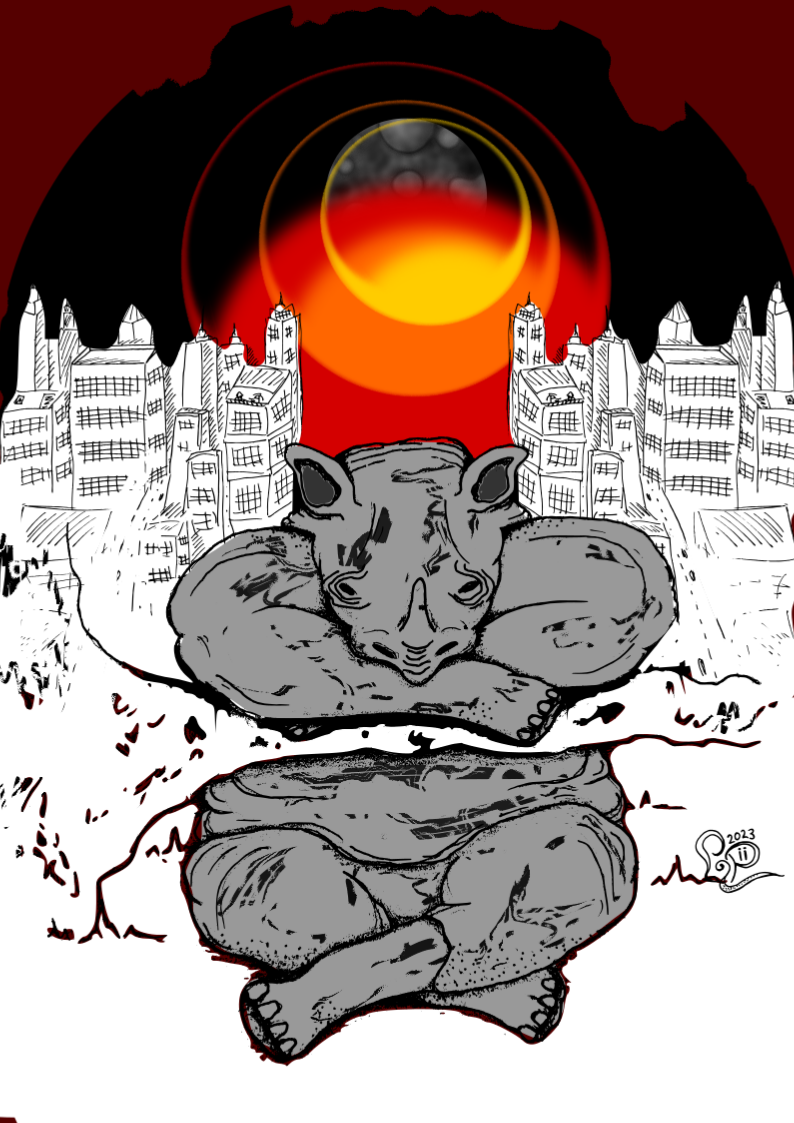 Voiko tehdä muutakin, kuin istua odottamassa kun maailma palaa? Tussipiirros, digieditointi.Hyvää yötä maailma