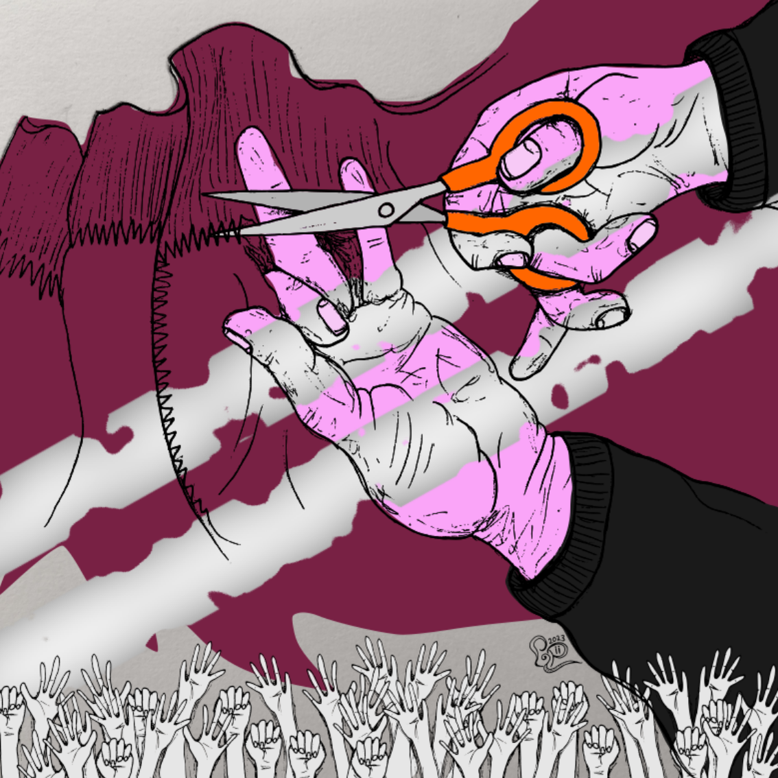 Sairaus jonka oikuttelua en osaa ennakoida. Tussipiirros, digieditointi.Fibromyalgia