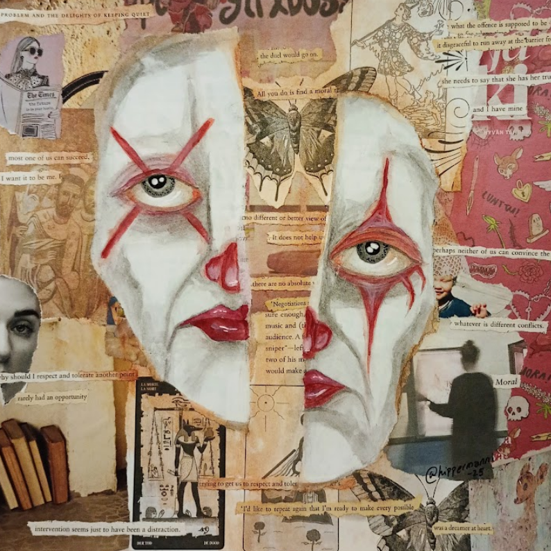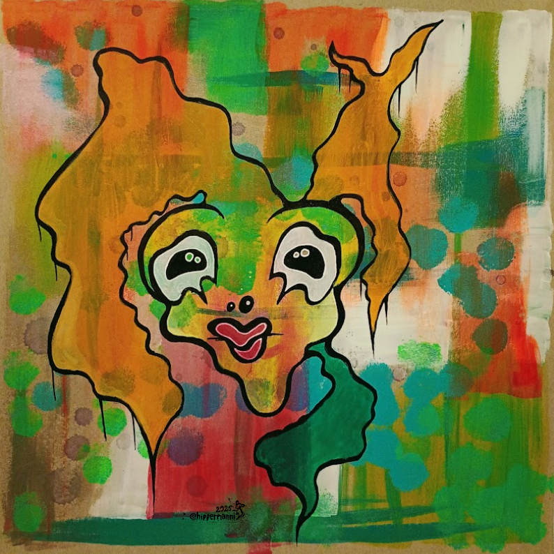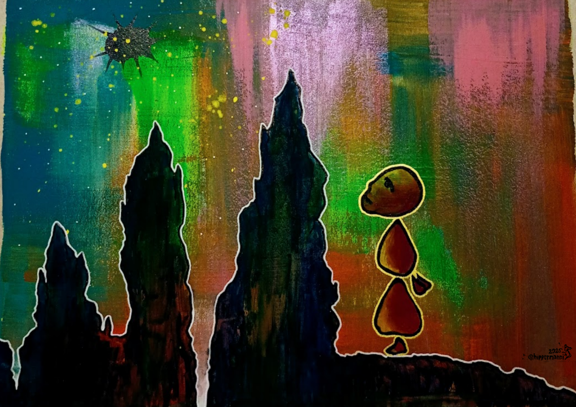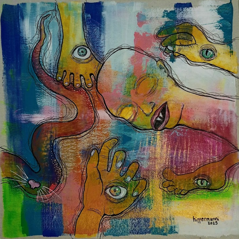Voin olla yhtäaikaa kaikkialla ja pelkästään tässä. Akryyli-/vesivärimaalaus, muste, kierrätyspahvi.My name is mud