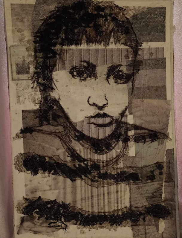 Se tunne kun voimavarat vaan katoaa… Tussipiirros/vesivärimaalaus, kierrätyspaperi.Mademoiselle