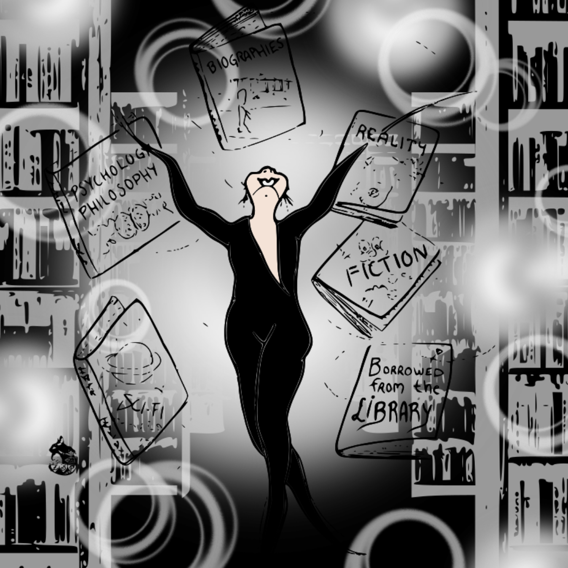 Jollei omassa kuplassa niin tarinoissa. Tussipiirros, digieditointi.Kirjastossa