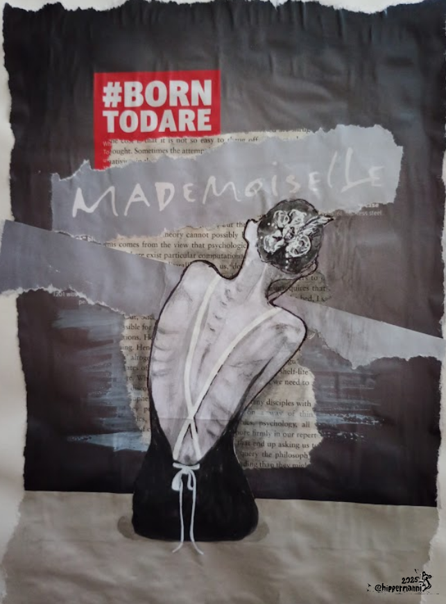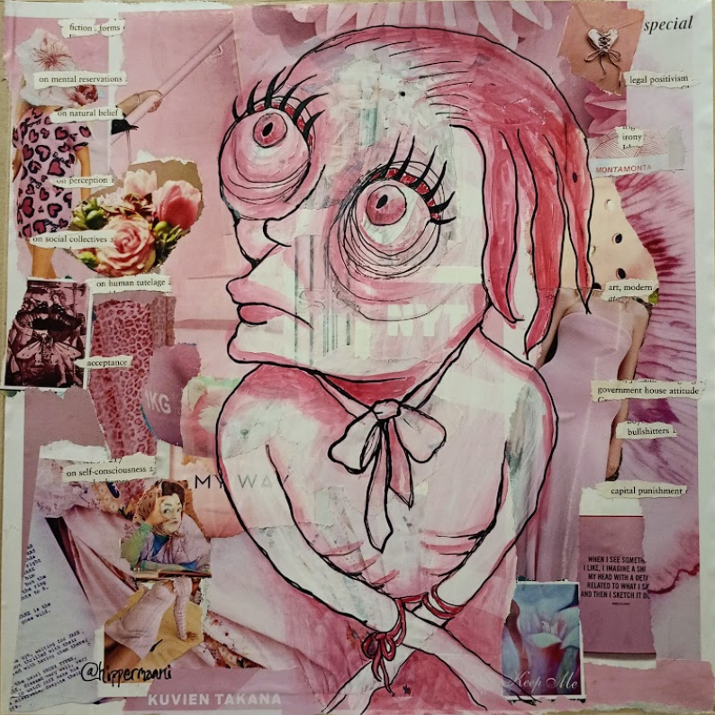 Voihan muovisuus ja kauneusihanteet. Vesivärimaalaus, muste, kierrätyspaperi.Materian vanki