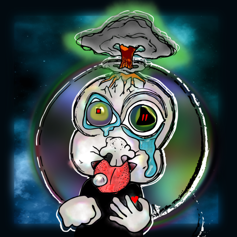 Ei tarvi mitään ulkoista silloin kun on kyky trippailla elämää itsessään. Tussipiirros, digieditointi.Mushroomboi