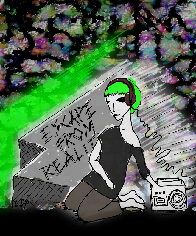 Höpö höpö. Kaikki on todellisuutta eikä todellisuutta ole olemassa. Tussipiirros, digieditointi.Pakoon todellisuutta