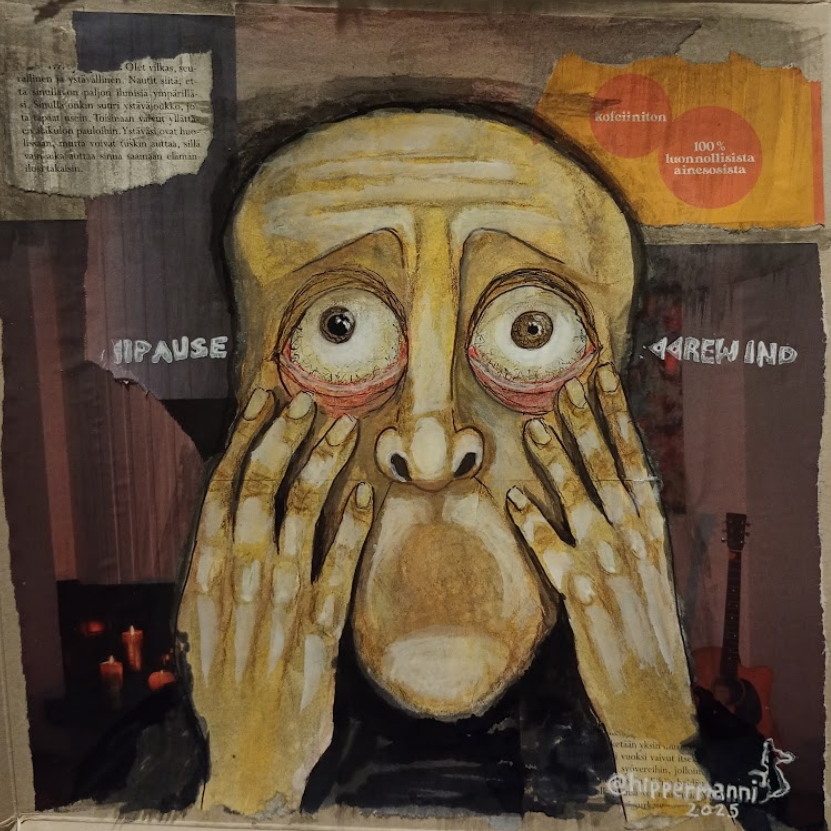 Jotkut väittää kärkkääksi. Multa vaan puuttuu paussi, suodatin ja takaisinkelaus. Vesivärimaalaus, muste, kierrätyspaperi.pause n rewind