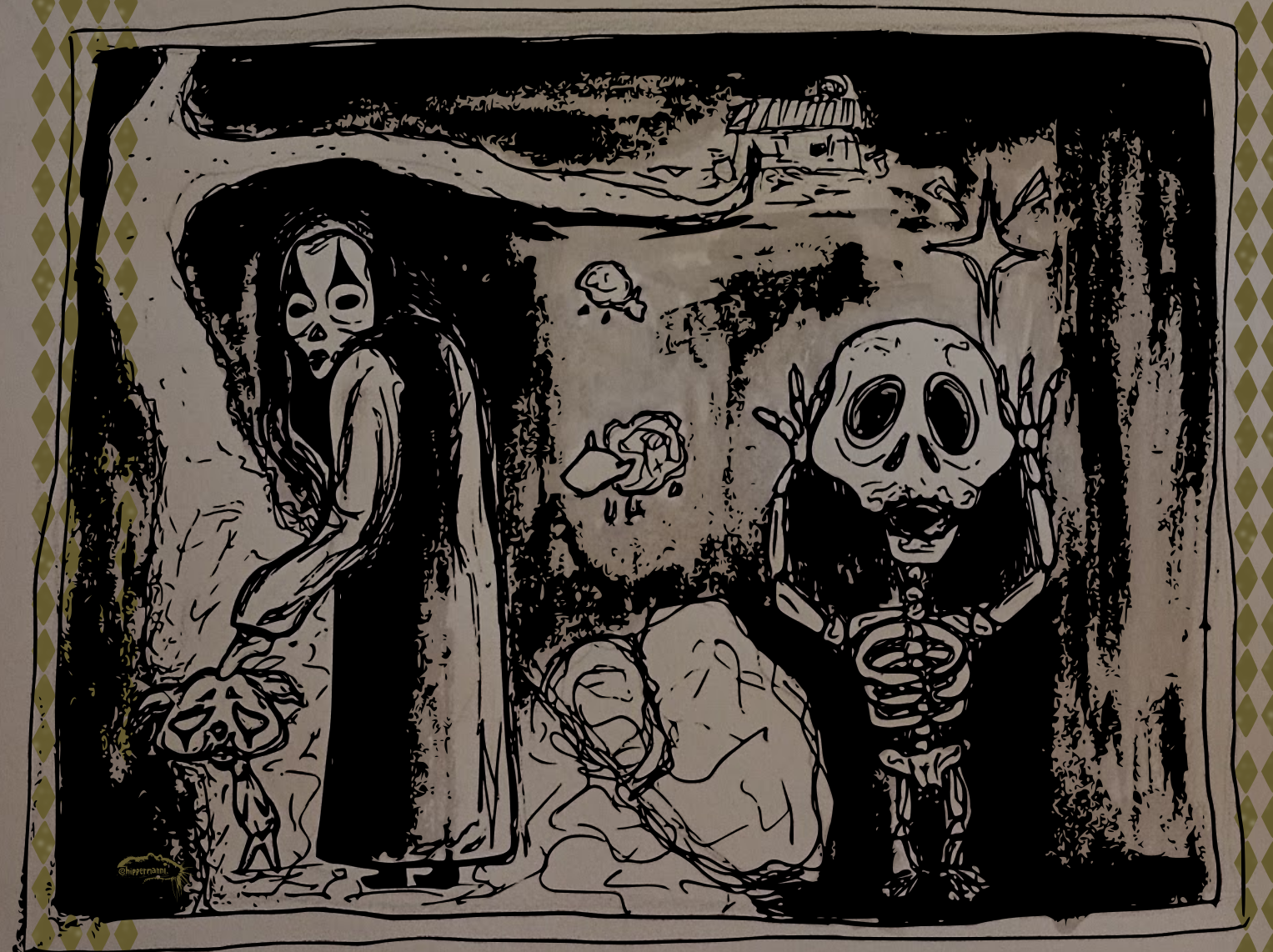 Ystävän kuolema satutti. Tussipiirros, digieditointi.Farewell bunnyrabbit