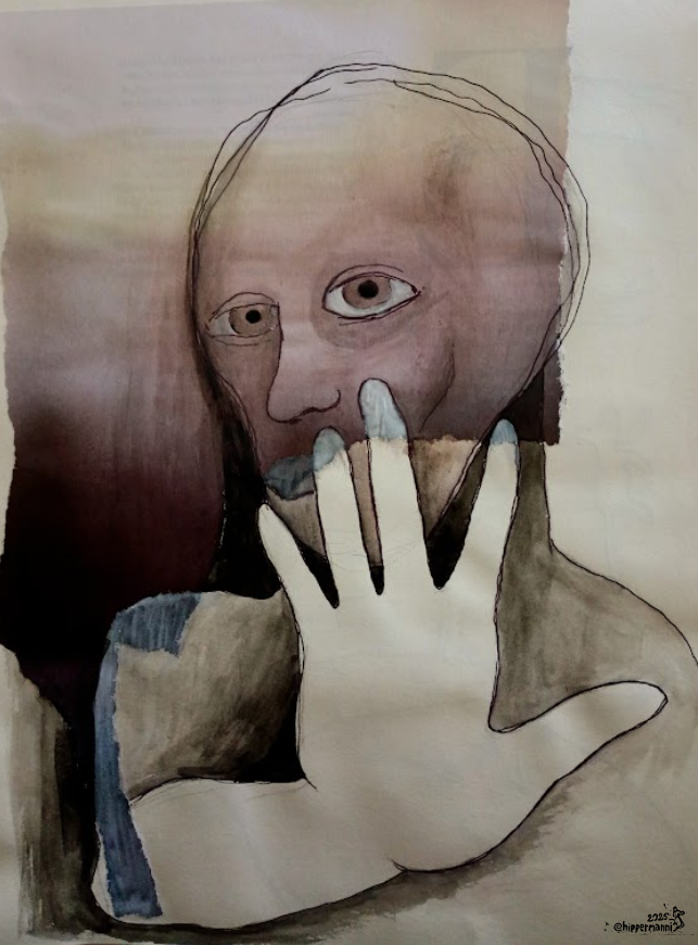 Jokainen loukkaa ja jokaista loukataan. Vesivärimaalaus, muste, kierrätyspaperi.Will you forgive me Nicholas?